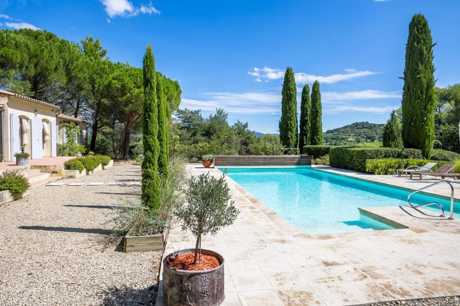In a privileged, quiet environment, property completely renovated with taste and quality materials for a living area of 214 m² on a beautiful landscaped plot of land with views of 2.3 hectares. The house, very bright, consists of a large entrance hall, a living room with fireplace opening onto a very beautiful covered terrace of 21 m², a kitchen, utility room, a dining room, 4 bedrooms with their adjoining bathroom, an office and a second mezzanine living room upstairs. Heated swimming pool 6.5 x 13 m, workshop 15 m², tiled awning for cars. Heating by underfloor heat pump in part of the house and by reversible air conditioning for the rest, solar panels for the water heater.