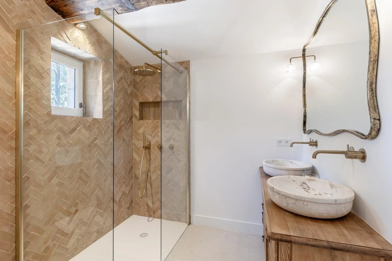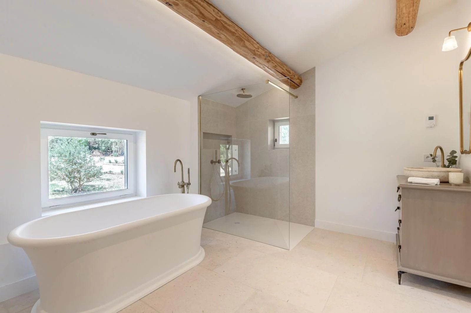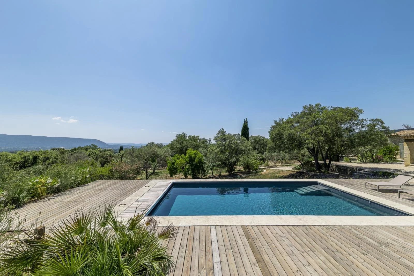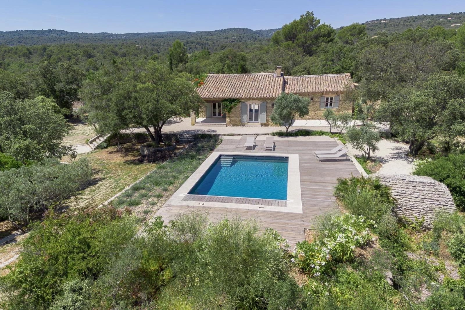 In a quiet location, superb property consisting of a fully renovated farmhouse using high-quality materials on a beautiful 1.4 hectare plot with views of the village of Gordes and the Luberon mountains. The single-storey farmhouse has 4 bedrooms and 4 bathrooms, a large open-plan kitchen with dining room, a living room with fireplace and large bay windows harmoniously connecting the living spaces to the garden. The land is enclosed by stone walls and decorated with an olive grove, large trees and a 5 x 10 m swimming pool surrounded by a wooden deck. The finishes are neat and high-end with heating and air conditioning in all rooms, the house is supplied with city water and has a borehole, the septic tank is new.