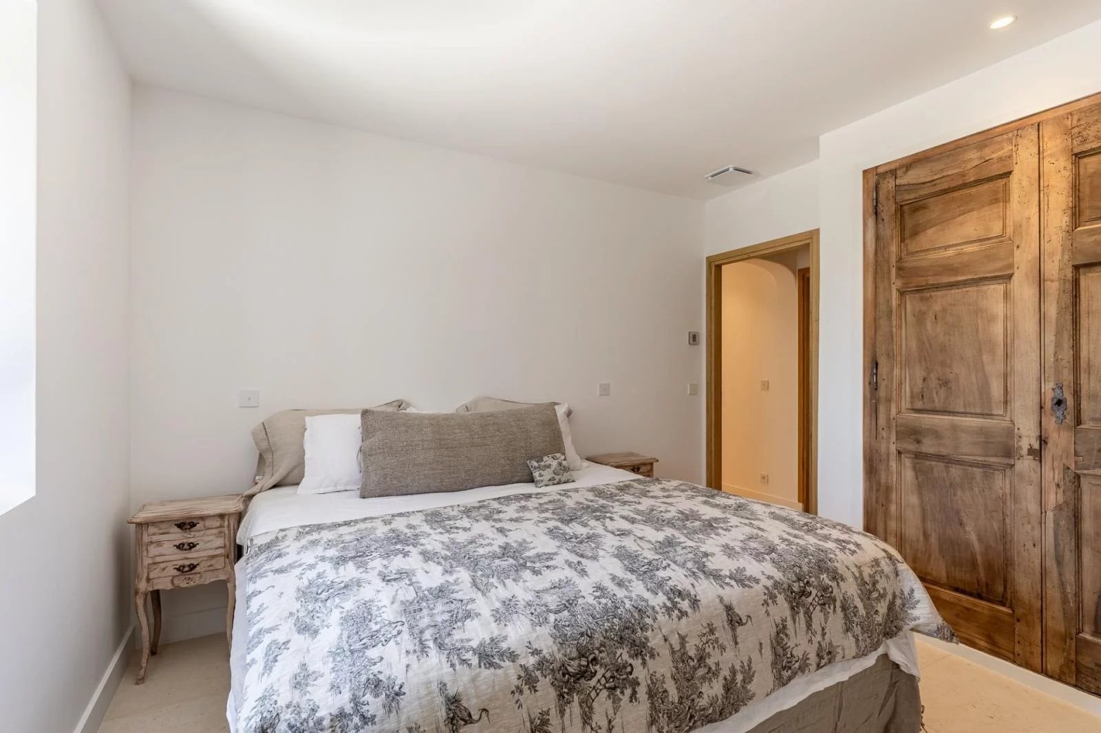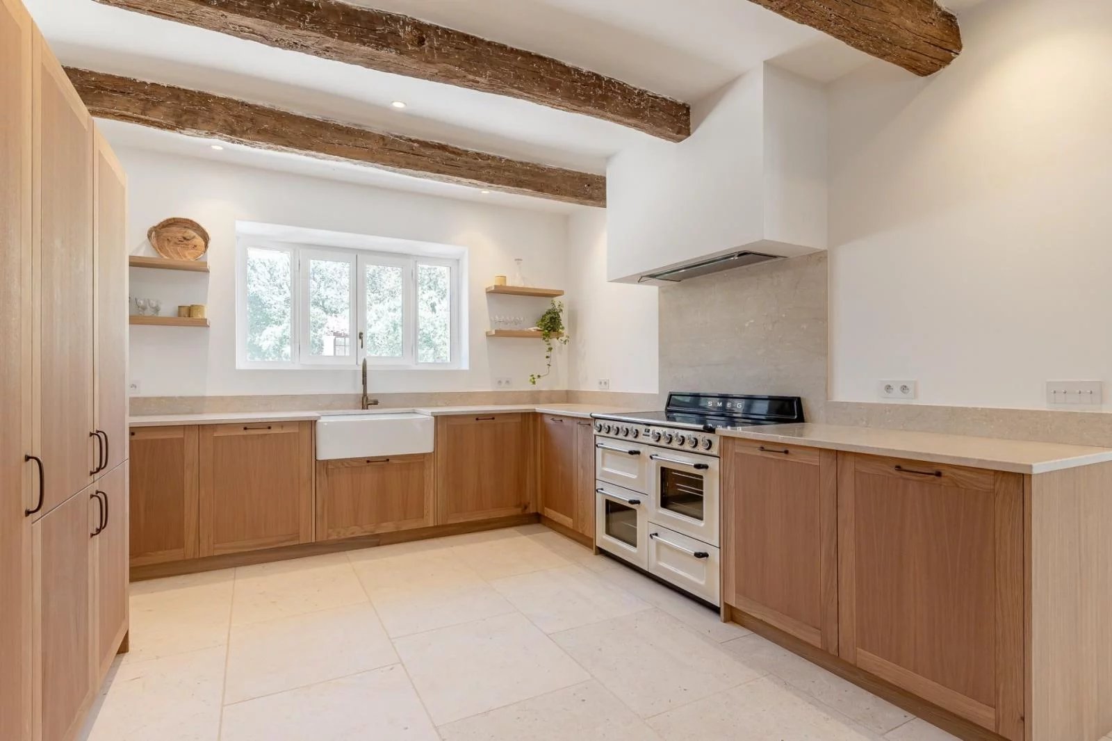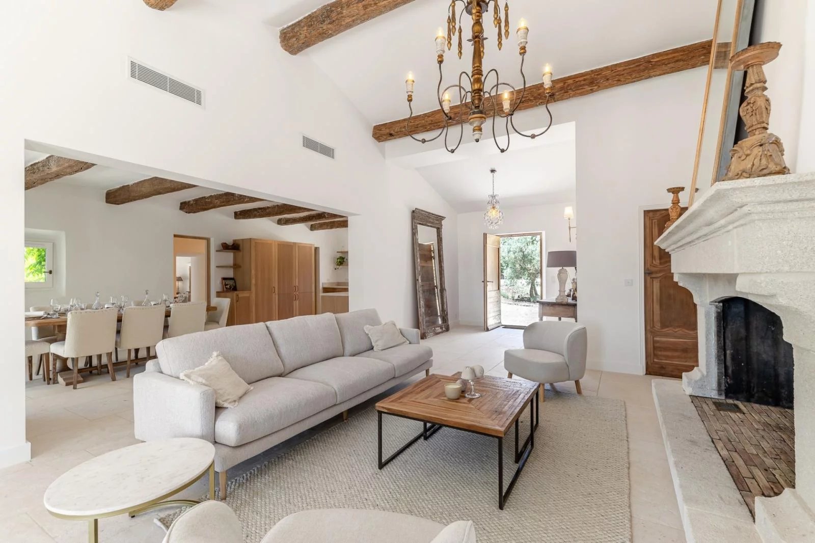 In a quiet location, superb property consisting of a fully renovated farmhouse using high-quality materials on a beautiful 1.4 hectare plot with views of the village of Gordes and the Luberon mountains. The single-storey farmhouse has 4 bedrooms and 4 bathrooms, a large open-plan kitchen with dining room, a living room with fireplace and large bay windows harmoniously connecting the living spaces to the garden. The land is enclosed by stone walls and decorated with an olive grove, large trees and a 5 x 10 m swimming pool surrounded by a wooden deck. The finishes are neat and high-end with heating and air conditioning in all rooms, the house is supplied with city water and has a borehole, the septic tank is new.